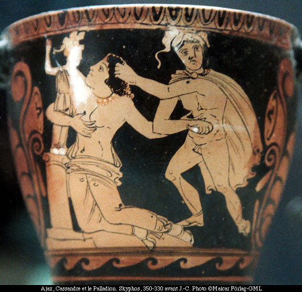 Como especial recompensa Agamenón recibió a Casandra... Cuando los griegos se disponían a regresar tras haber devastado Troya, fueron retenidos por Calcante, quien les dijo que Atenea estaba irritada con ellos por la impiedad de Áyax; quisieron matarlo, pero por haberse refugiado en el altar lo dejaron.